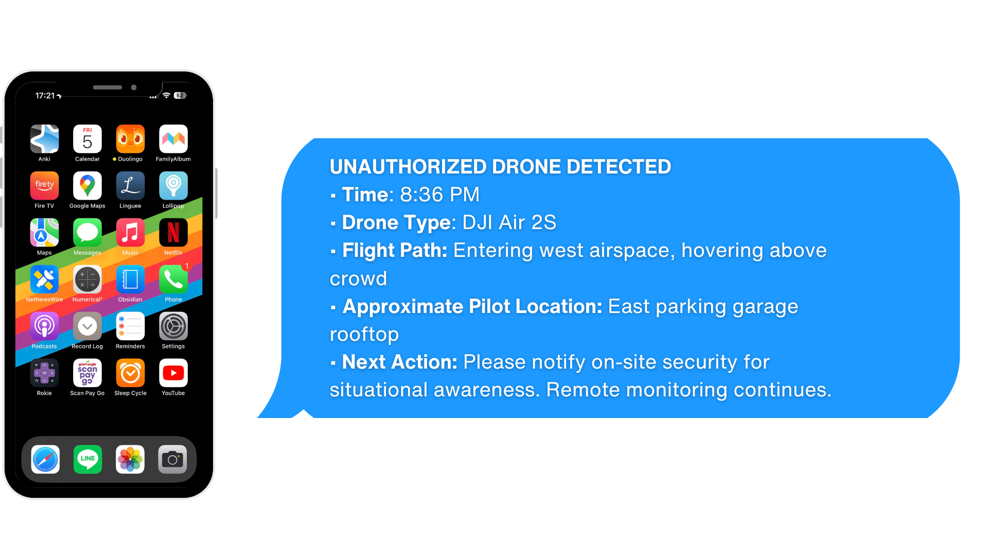 When our monitoring team detects unauthorized drone activity, they immediately notify your venue staff, security, and management via text message. This quick and direct communication keeps everyone informed in real time, enabling a fast and coordinated response without confusion or delay.